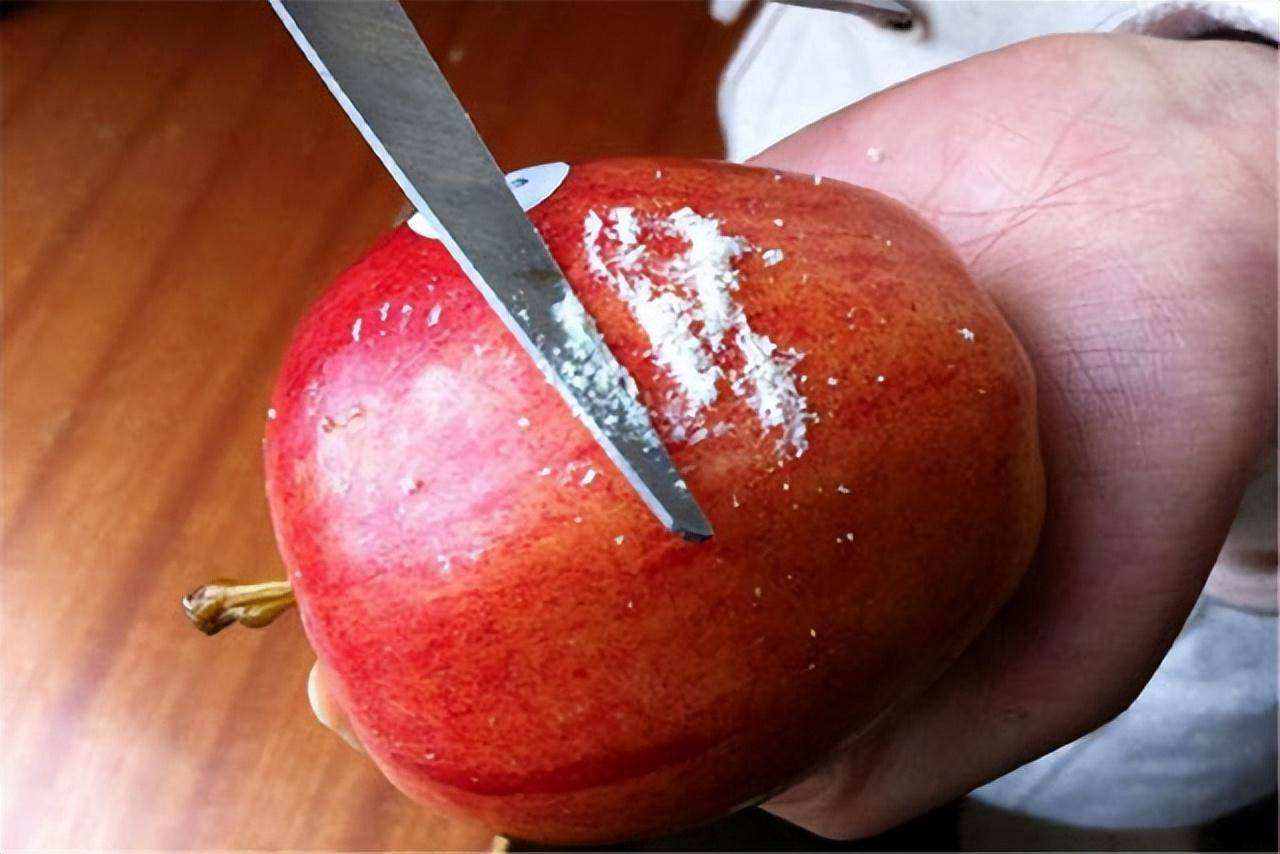 3.反復旋轉擦拭蘋果皮表面,會擦下一層紅色,果蠟很快被擦掉。
