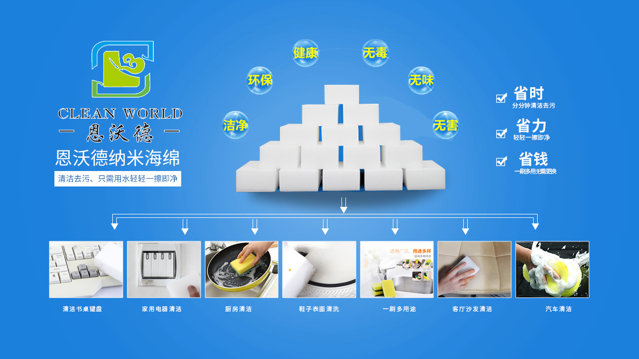 納米海綿是一種有高開孔率的三維網格結構的新型泡沫塑料,采用物理去污的機理,依靠納米海綿特殊三維網狀結構(每個小顆粒比頭發絲的萬分之一還小)將其浸濕后,其內部就會形成無數個納米級毛細管開孔結構,在抹拭過程自動吸附物體表面的污漬。所以這些海綿塊只需要加一點水,就變成清潔力強的產品,可以擦拭頑固的污漬,也不用擔心會有刺激性化學物質。納米海綿可以用于家中的大多數物品的表面,從油煙機到灶臺、墻壁上的畫畫印記、浴室里的水漬水垢、浴缸污垢、茶杯里的茶漬、墻壁劃痕等通常難以擦洗的表面。